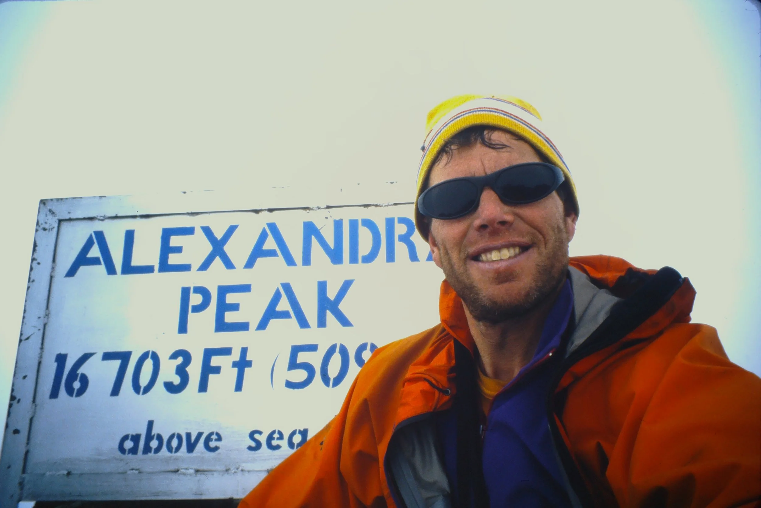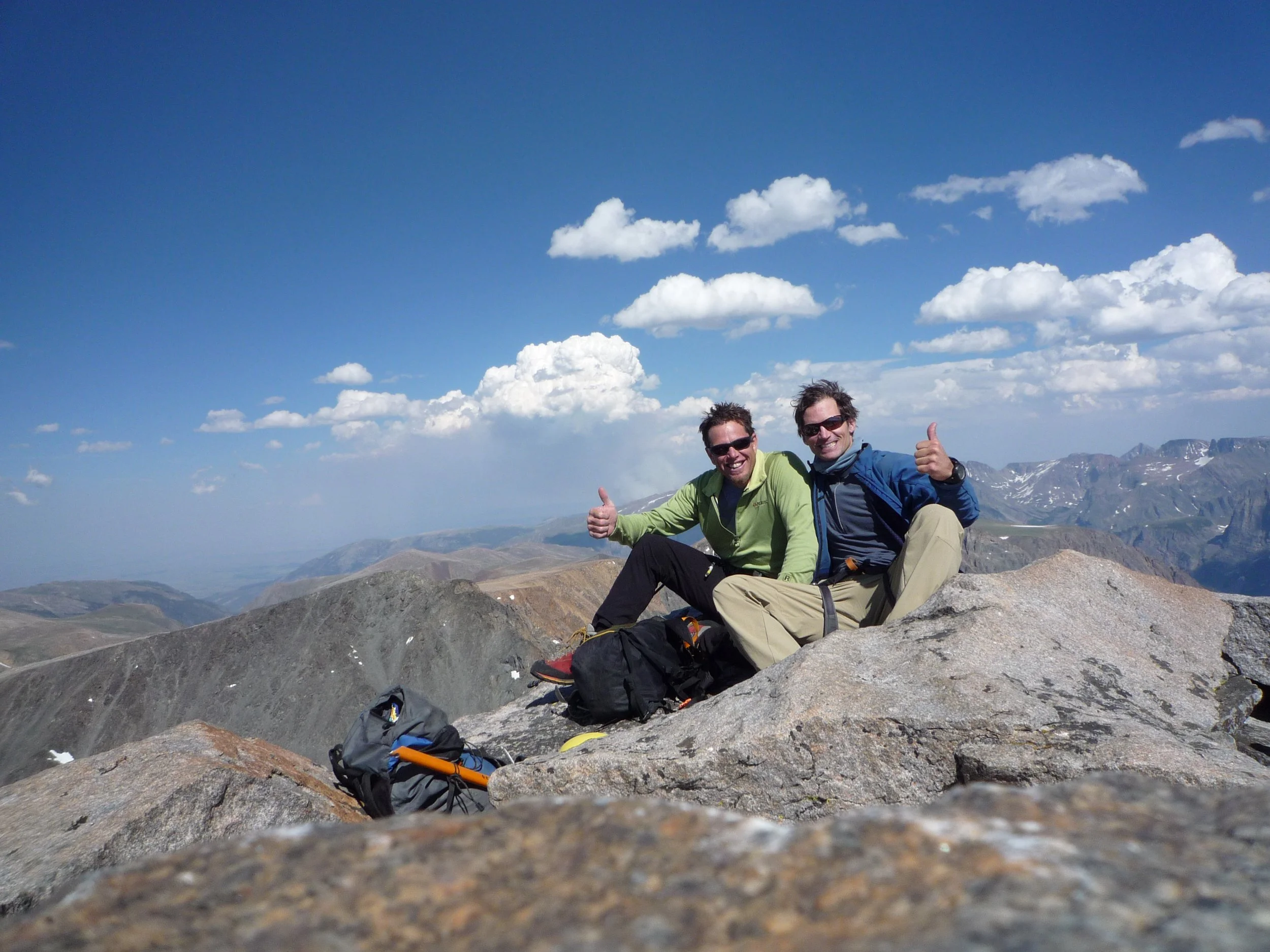 Man with sunglasses and a colorful beanie smiling for a selfie at Alexander Peak, which is 16,703 feet high, above sea level.
