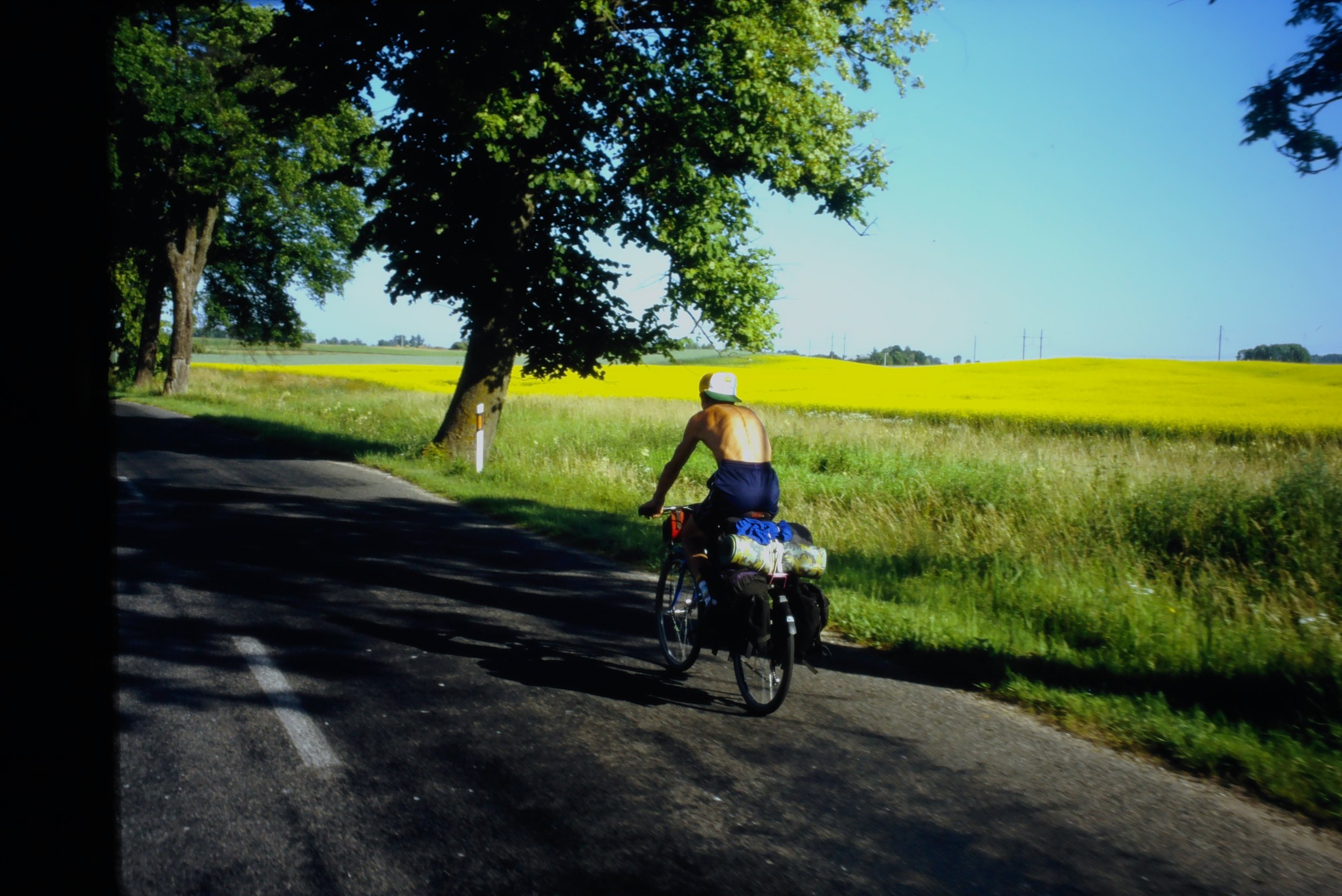 A person riding a bicycle along a rural road with green trees and yellow fields in the background, under a clear blue sky.