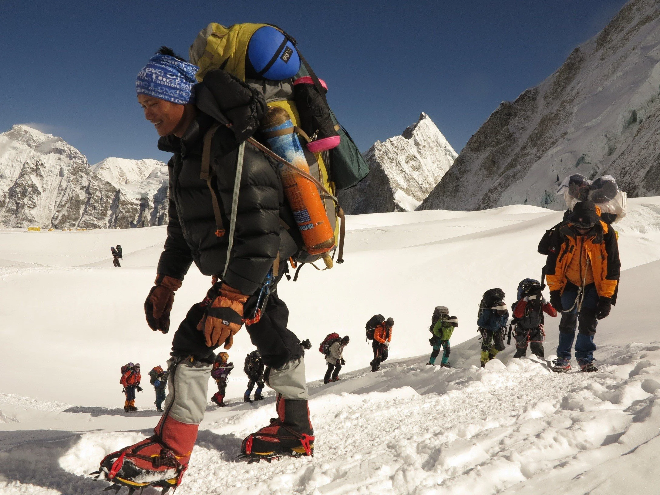 A group of mountaineers, dressed in colorful gear, climbing a snowy slope in a high-altitude, icy environment with tents visible in the background.