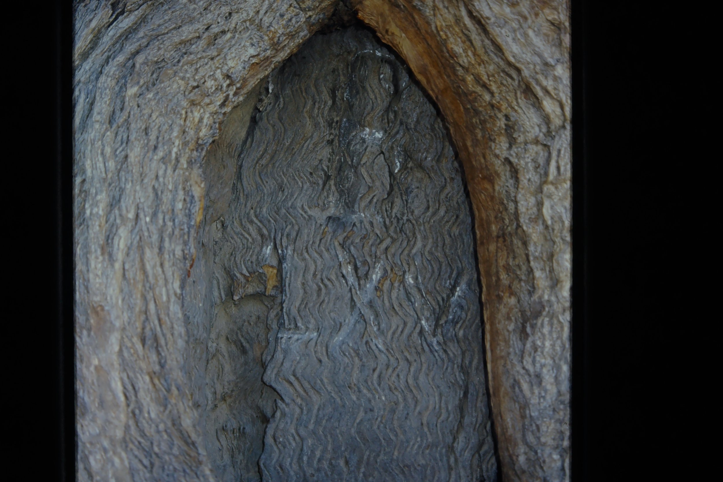 Close-up of a carved stone with wavy lines, set within a textured stone frame.