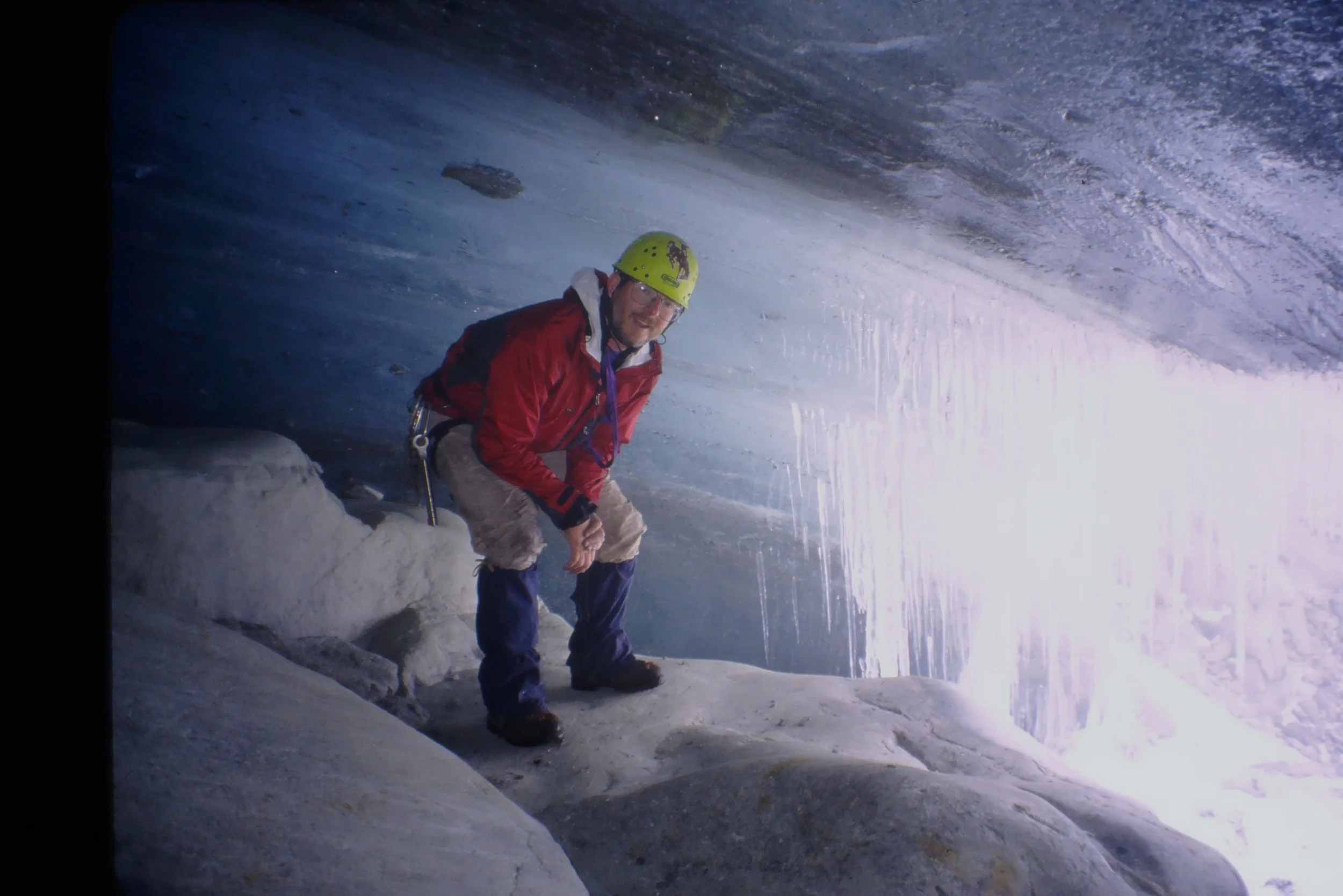 A man in a red jacket, helmet, and outdoor gear inside an ice cave with icy walls and floor.