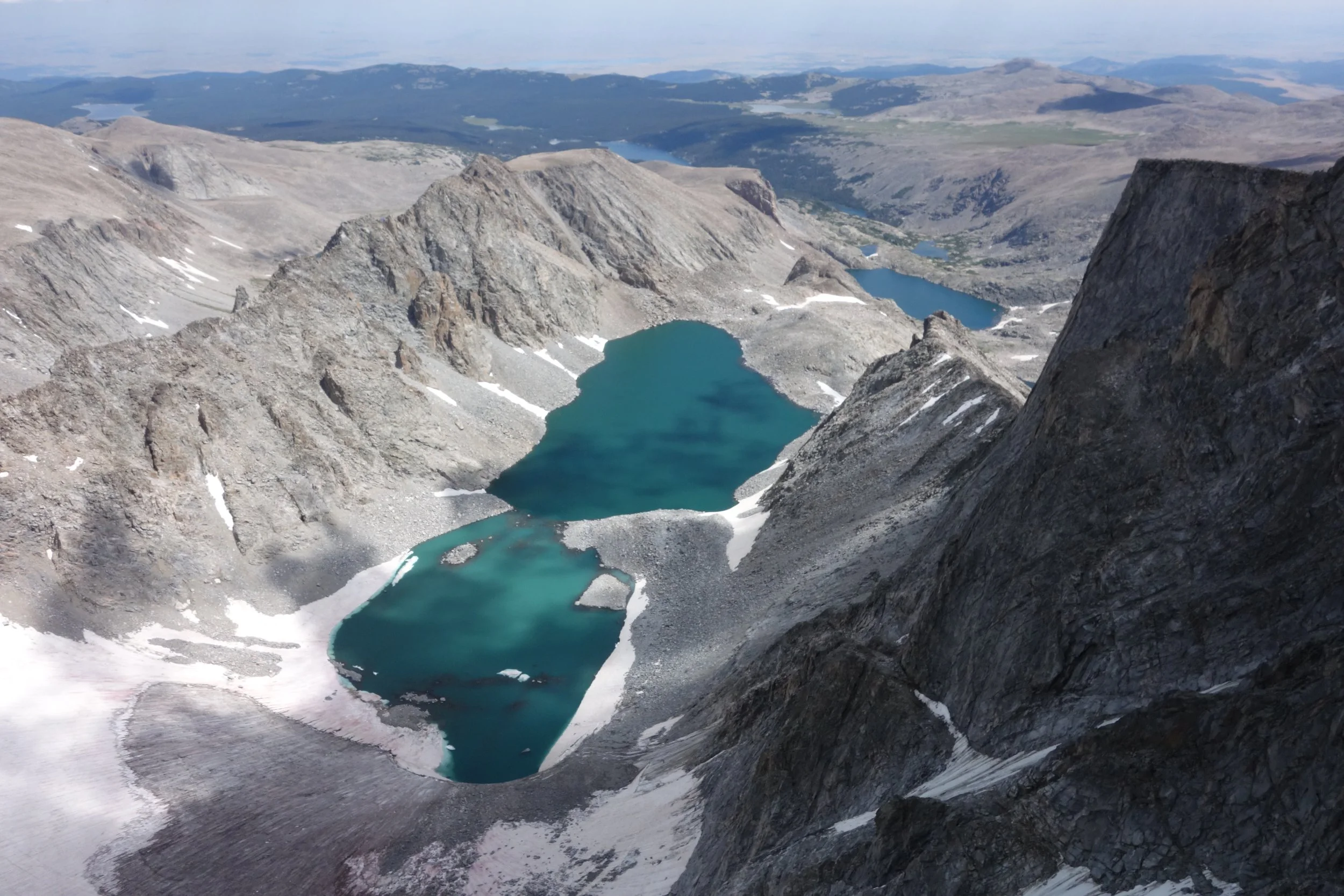 Aerial view of a mountainous landscape with two blue alpine lakes, surrounded by rocky terrain and snow patches, extending into distant hills and valleys.
