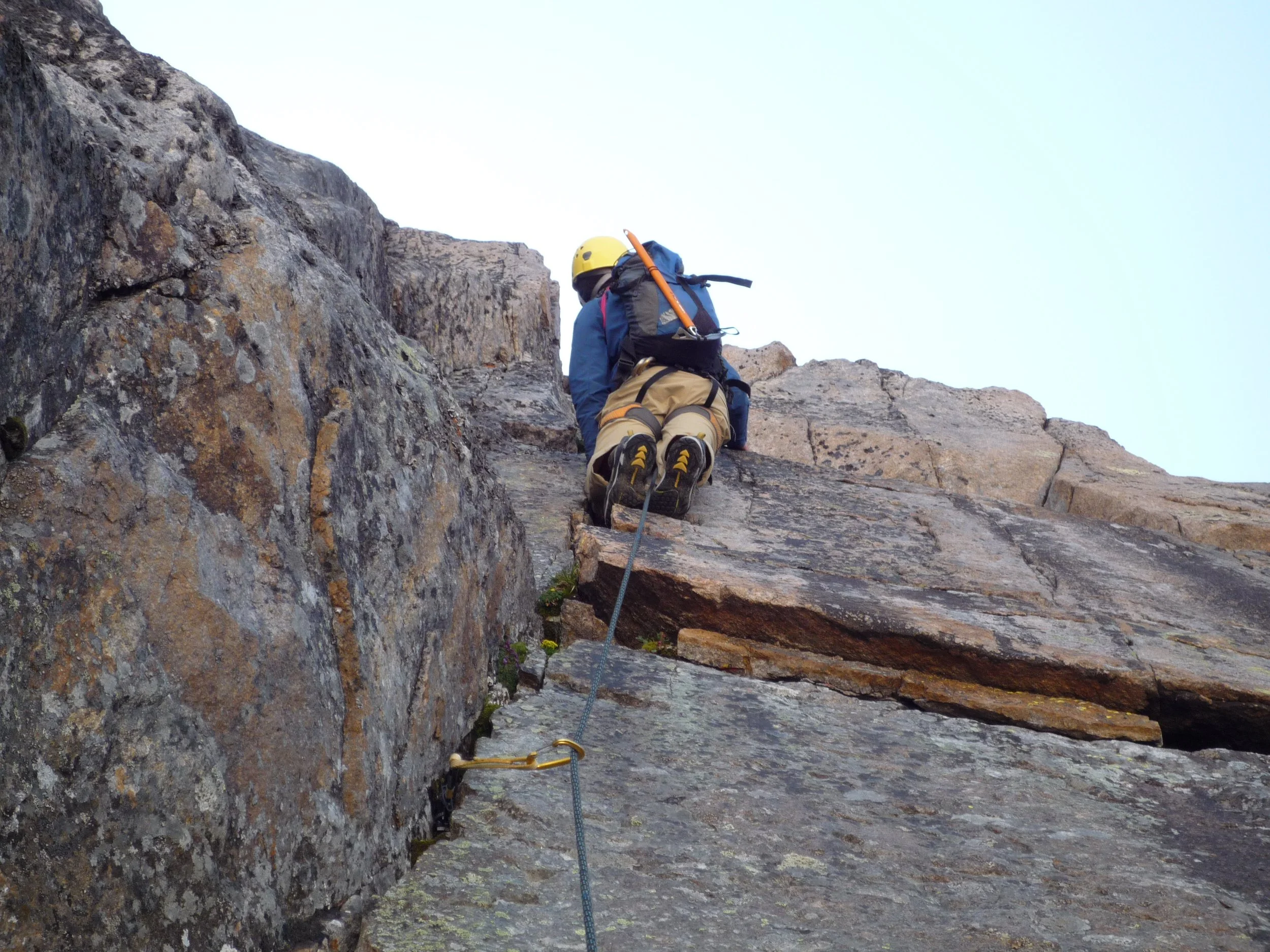 A climber with a red backpack and yellow gloves ascending a steep rocky slope on a mountain.