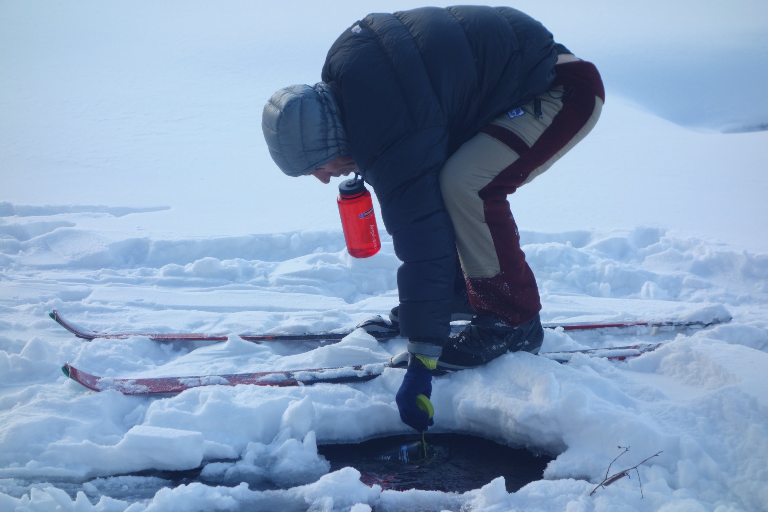 A person in winter clothing is kneeling on snow, filling a water bottle from a hole in the ice while on skis.