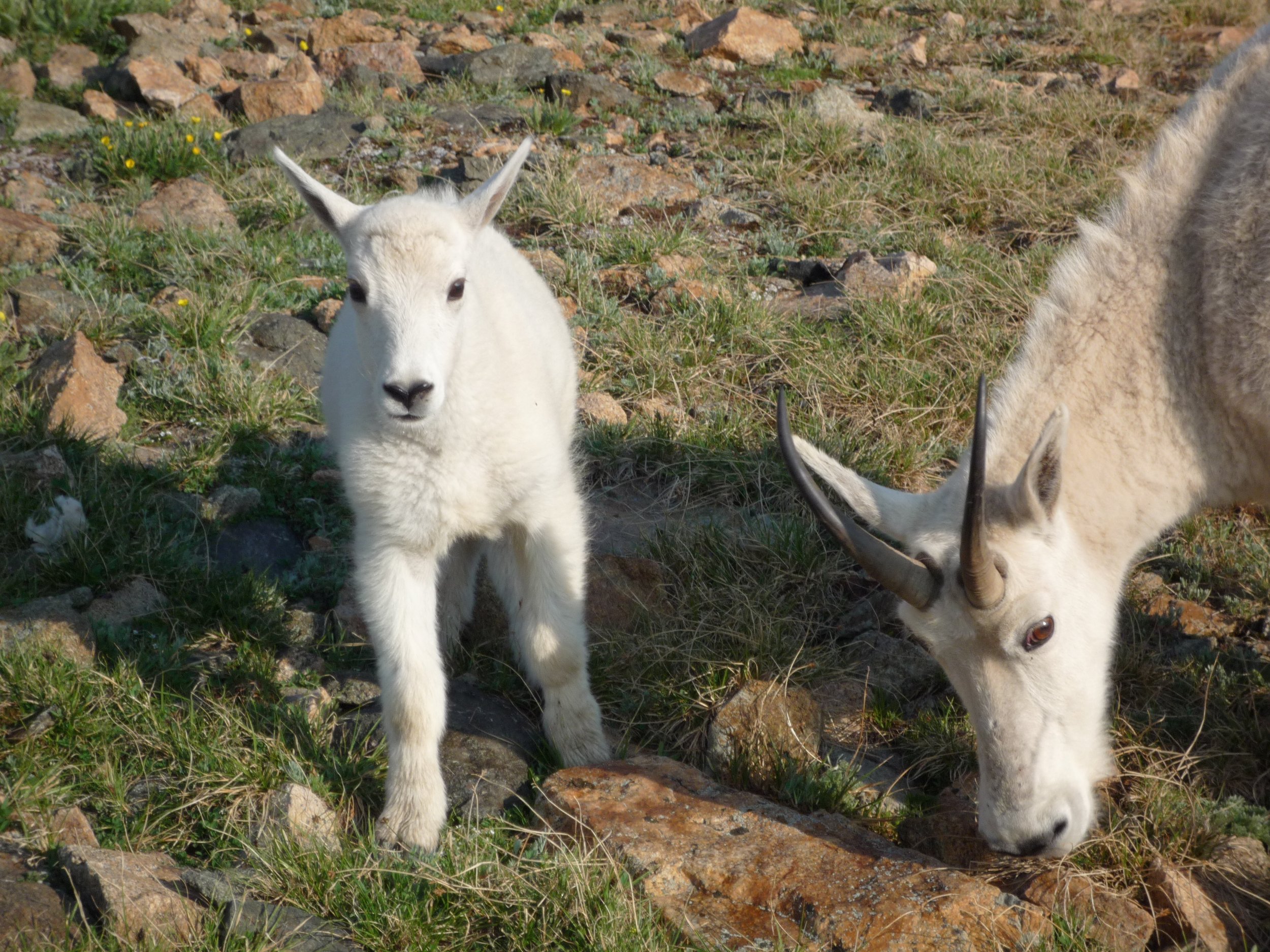 A young mountain goat kid standing on rocky ground with a white coat, black nose, and upright ears, and an adult goat with curled horns grazing nearby.