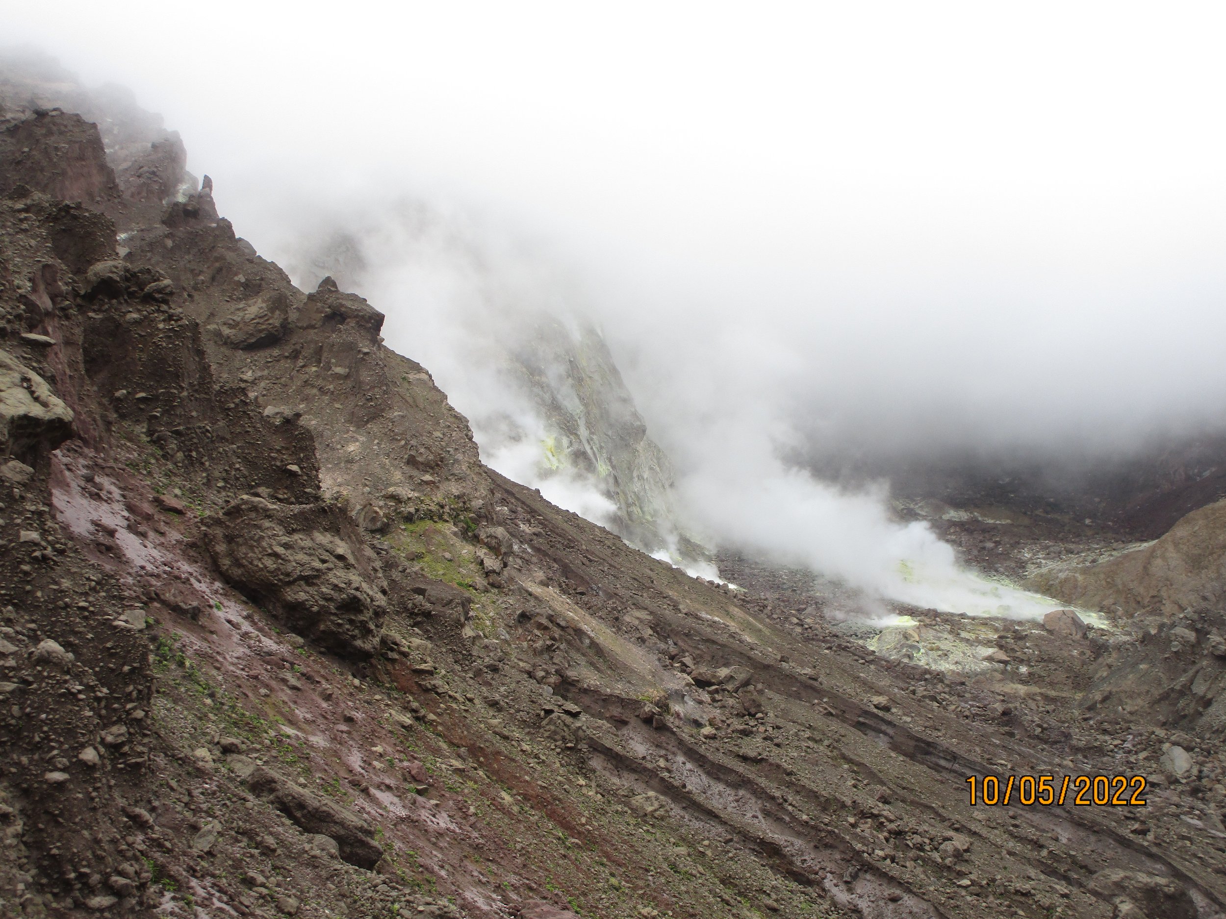 Volcanic landscape with steep, rocky, and ash-covered slopes, emitting steam and gases, with clouds and fog in the background.