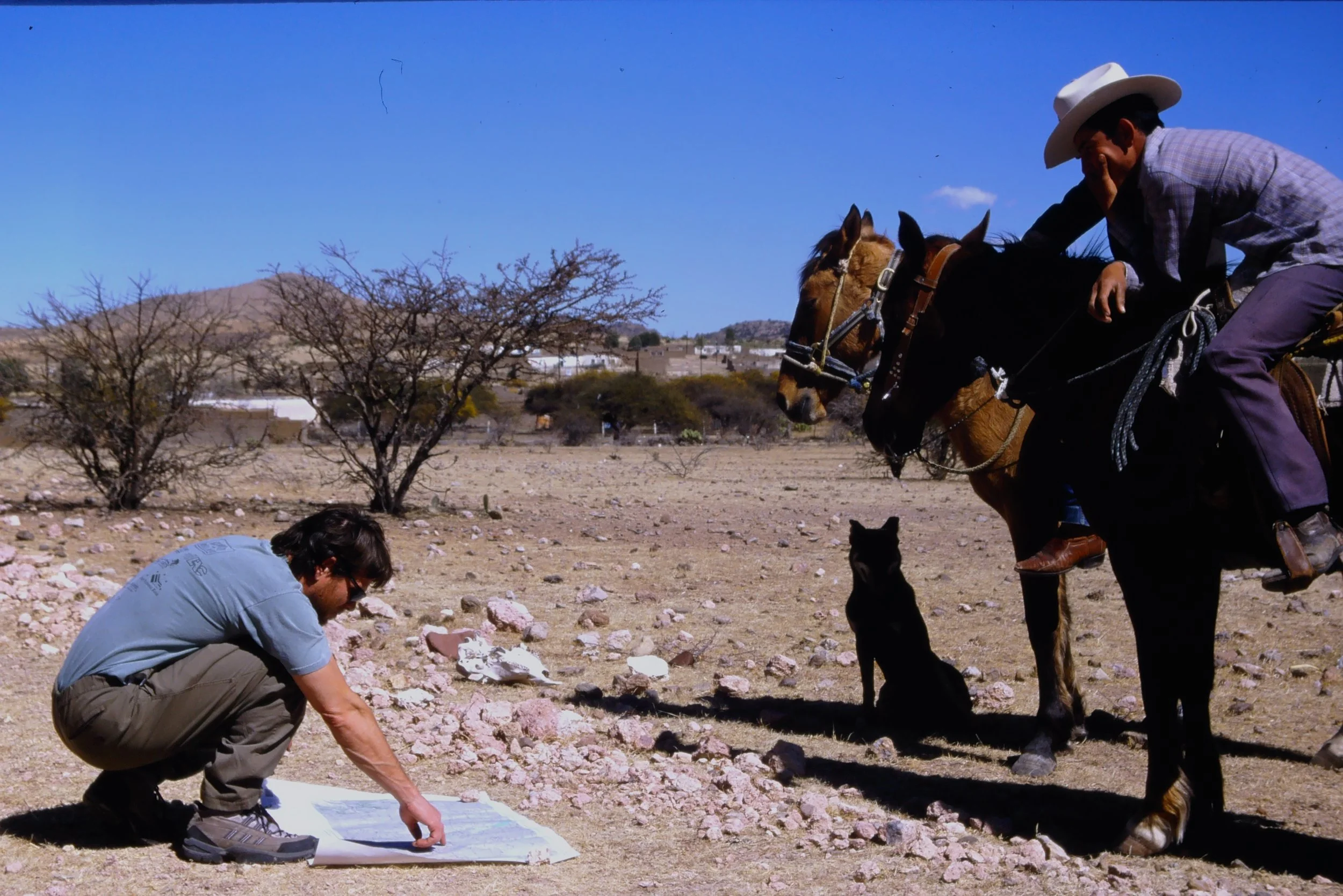 A man on horseback and a woman kneeling on the ground in a desert landscape with leafless trees. The woman is pointing to a large map on the ground, while a black dog sits nearby and watches.