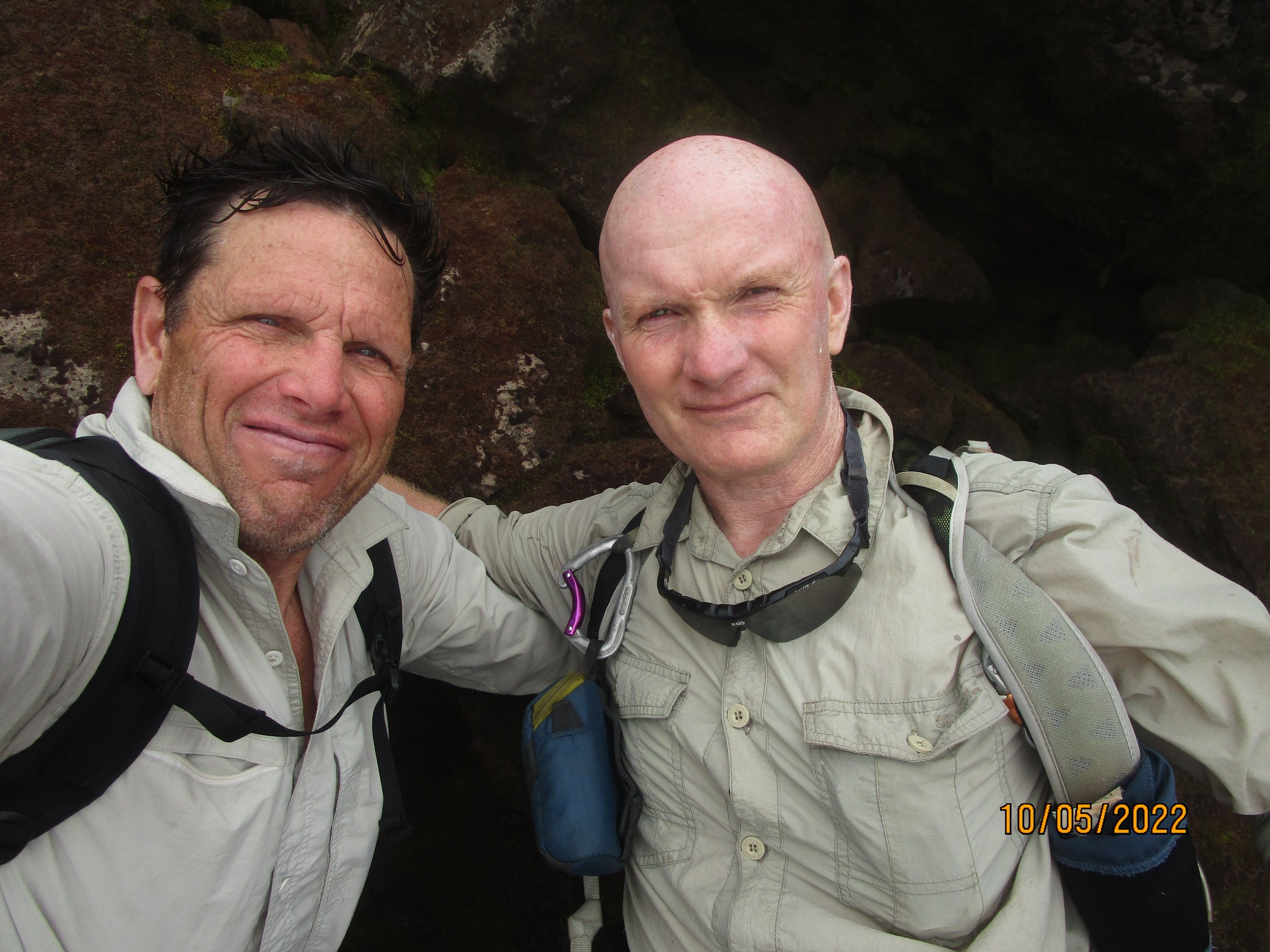 Two men in outdoor hiking gear taking a selfie in front of a rocky cave or formation."
