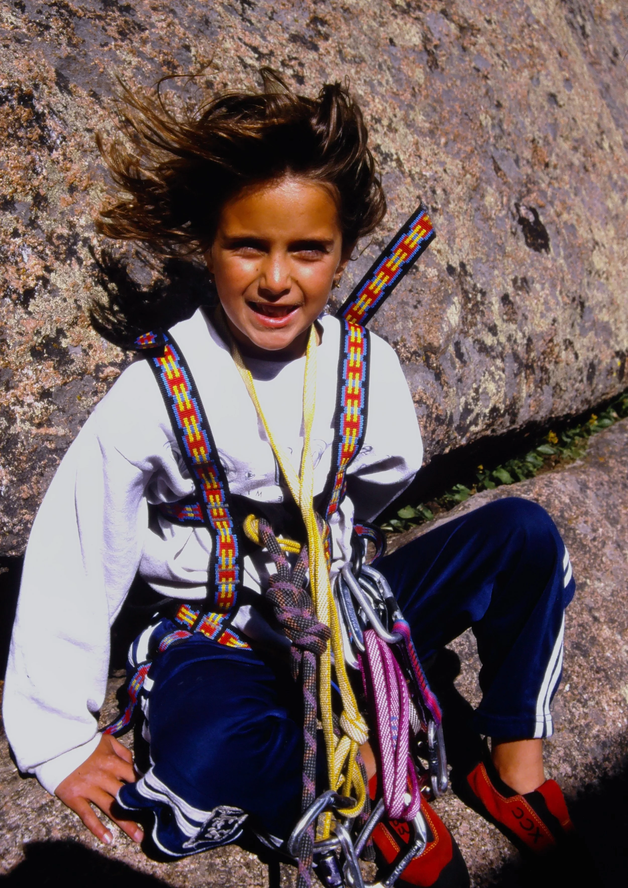 A young girl with long brown hair, smiling, sitting on a rock, equipped with climbing gear, including harnesses and carabiners, outdoors on a rocky surface.