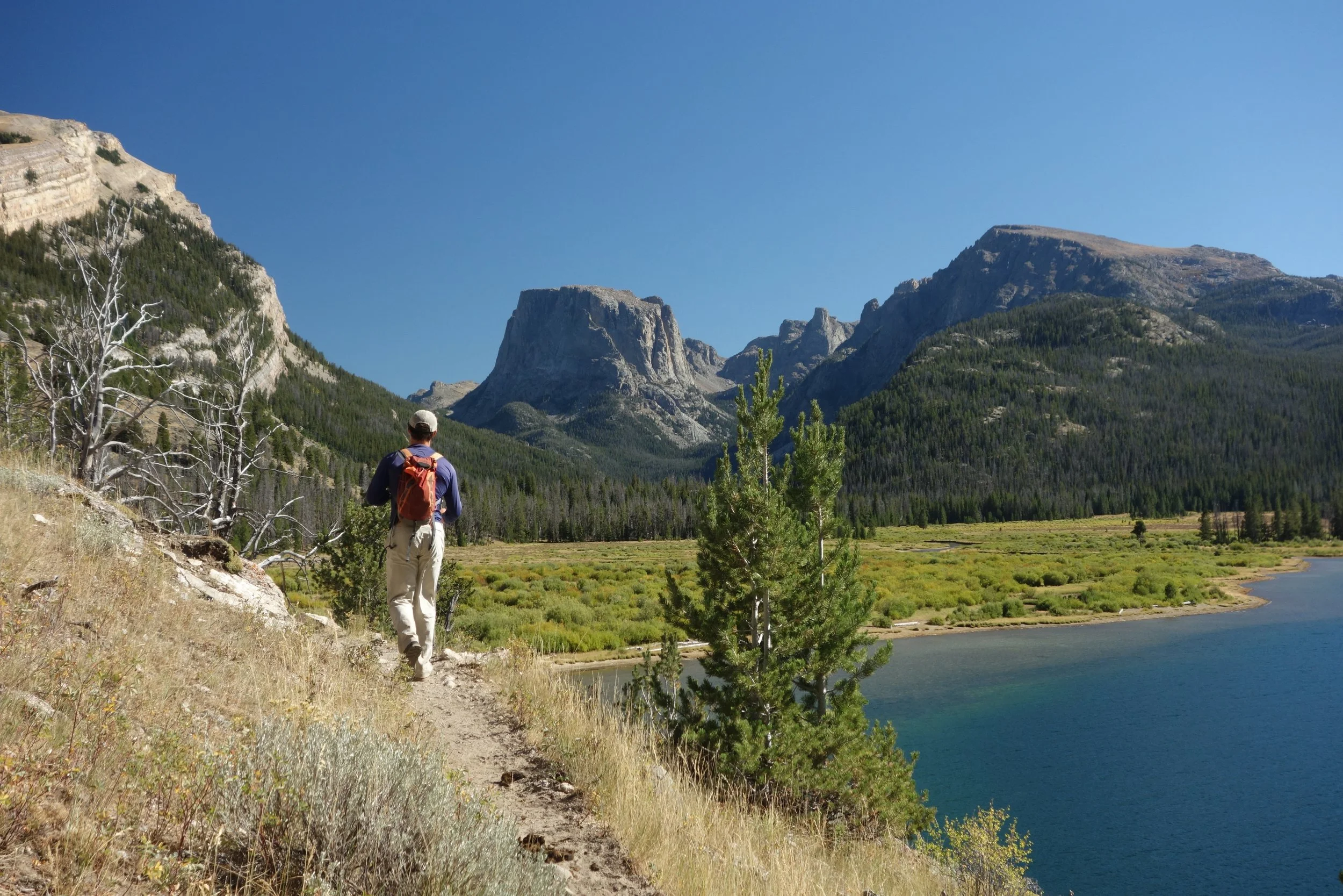 A person hiking along a trail next to a lake with mountains in the background during a clear day.