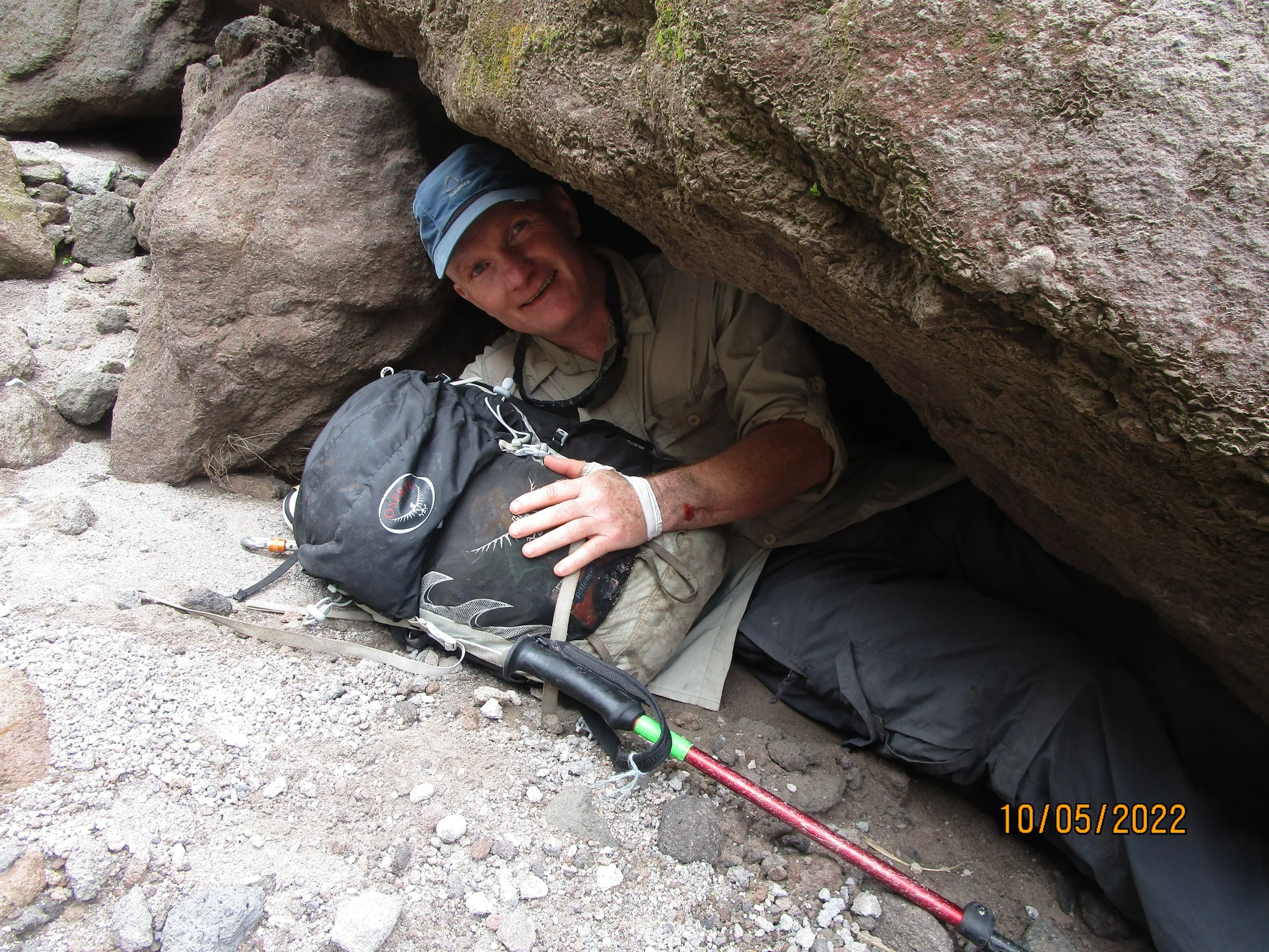 A man is crawling through a small cave or crevice among rocks, smiling at the camera with a bandage on his arm and a hiking stick nearby.
