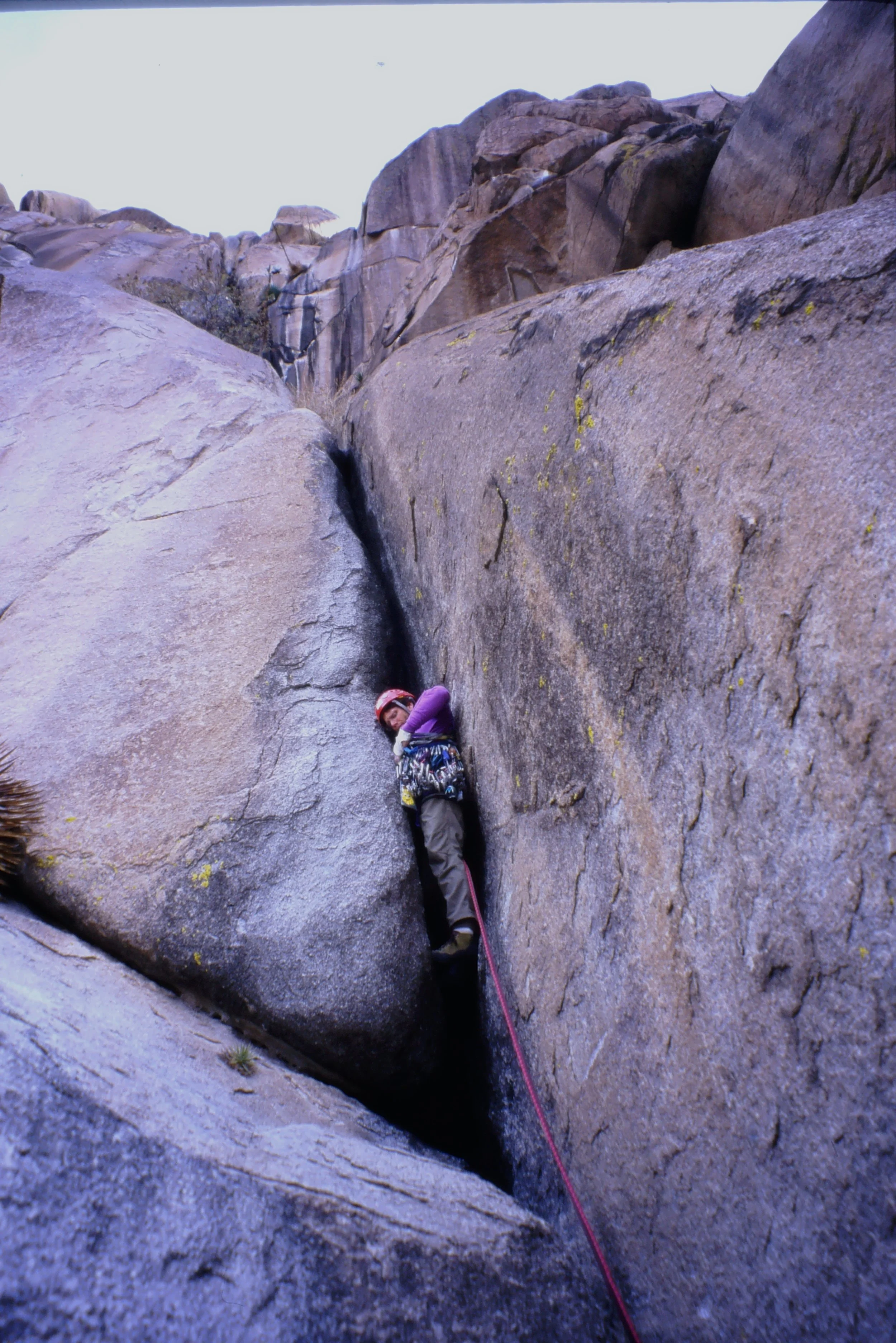 A person wearing a helmet and harness climbs a narrow crack in large granite rock formation.