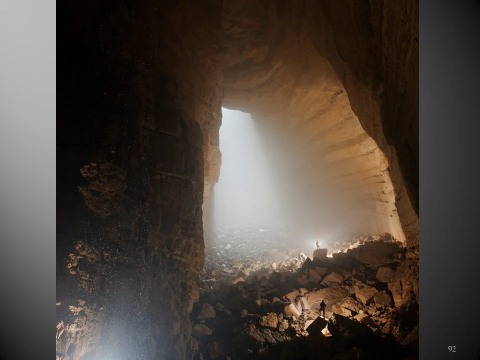 The image shows the interior of a large cave with a wide opening letting in sunlight. There are two small figures of people standing among rocks on the cave floor, illuminated by the light.