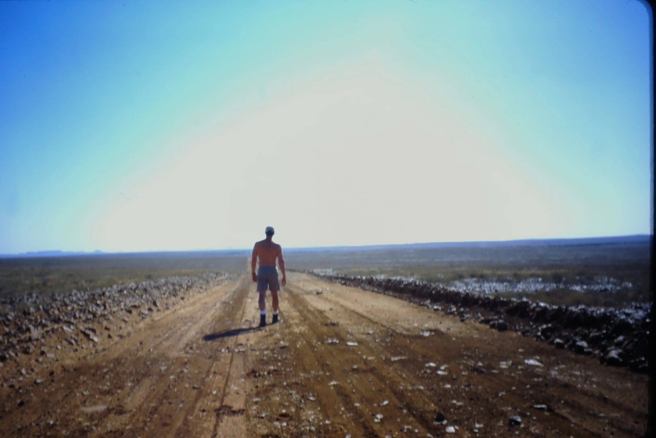 A man walking alone on a dirt road in a barren, flat landscape under a clear blue sky.